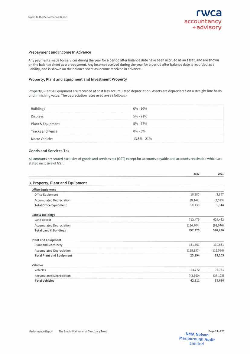CLOSINGVALUE Theaccompanyingnotesandauditor'sreportformpartofthesefinancialstatements. PerformanceReport TheBrook(Waimarama)SanctuaryTrust Page19of23 Signage 1,500 10.00% SL 1,500 Signage2007 1,219 10.00% SL 1,219 TadorPhone(TelephoneSystems) 1,586 1,015 36.00% SL 571 1,142 444 TradeSiteBoxes 1,368 137 30.00% SL 137 1,368 Transmitter-Rotary 6,493 30.00% SL 6,493 Traps 21,271 10.00% SL 21,271 Traps2007 955 10.00% SL 955 Traps2010 2,086 68 10.00% SL 68 2,086 Traps2016 4,870 3,125 10.00% SL 487 2,232 2,638 Yamaha-2800wInverter 2,278 699 16.00% SL 365 1,944 334 TotalPlant&Equipment-atCost 130,631 26,786 3,066 7,614 108,392 22,239 Total 5,290,987 4,540,228 210,384 4,492 158,026 675,943 4,588,095