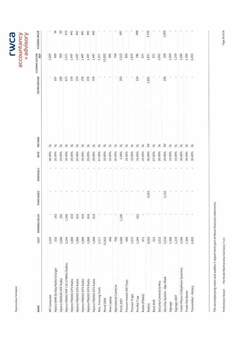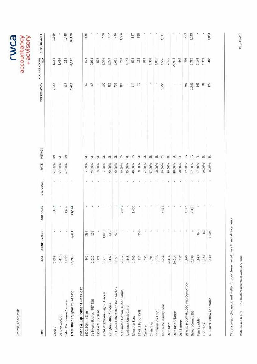 CLOSINGACCUM DEP CLOSINGVALUE Theaccompanyingnotesandauditor'sreportformpartofthesefinancialstatements. PerformanceReport TheBrook(Waimarama)SanctuaryTrust Page19of23 Signage 1,500 10.00% SL 1,500 Signage2007 1,219 10.00% SL 1,219 TadorPhone(TelephoneSystems) 1,586 1,015 36.00% SL 571 1,142 444 TradeSiteBoxes 1,368 137 30.00% SL 137 1,368 Transmitter-Rotary 6,493 30.00% SL 6,493 Traps 21,271 10.00% SL 21,271 Traps2007 955 10.00% SL 955 Traps2010 2,086 68 10.00% SL 68 2,086 Traps2016 4,870 3,125 10.00% SL 487 2,232 2,638 Yamaha-2800wInverter 2,278 699 16.00% SL 365 1,944 334 TotalPlant&Equipment-atCost 130,631 26,786 3,066 7,614 108,392 22,239 Total 5,290,987 4,540,228 210,384 4,492 158,026 675,943 4,588,095