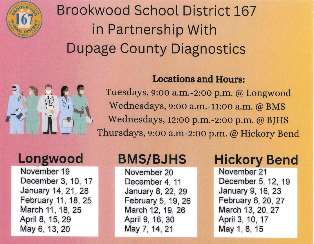 It’s not only Flu Season—we also have concerns about COVID-19 and RSV! Brookwood School District 167 has partnered with DuPage County Diagnostics to provide our students and staff with “FREE” weekly respiratory illness testing.