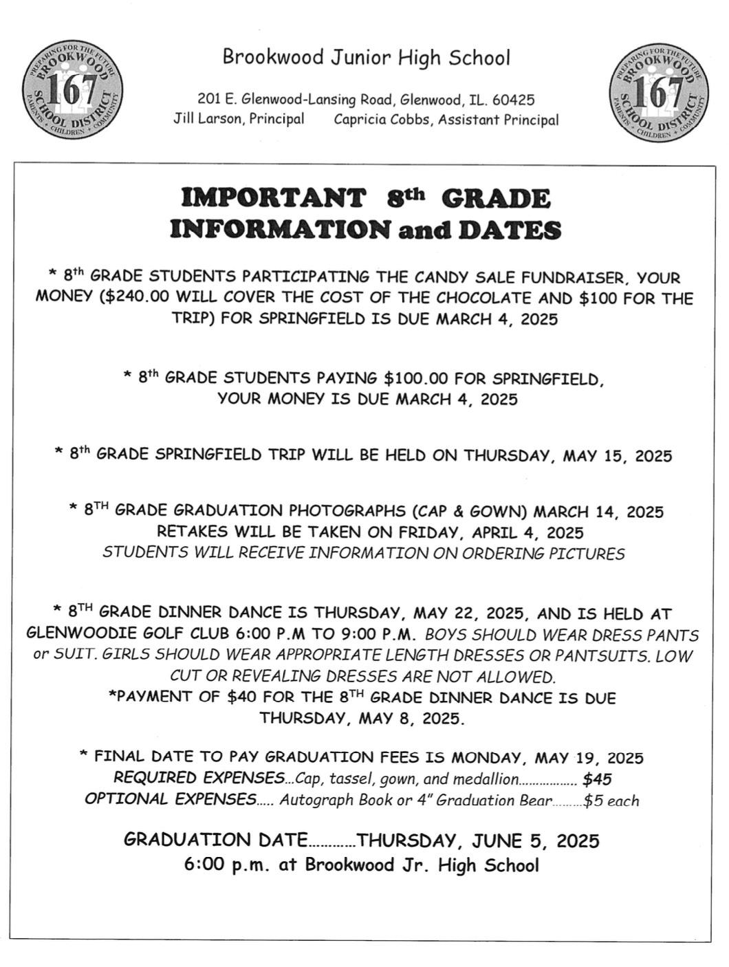 I can be reached at the school number (708) 758-5252, by email jlarson@brookwood167.org or by cell phone at (708) 362-0115 . As always, “Thank You” for your continued support and partnership. Your involvement makes a significant difference in our students’ success.