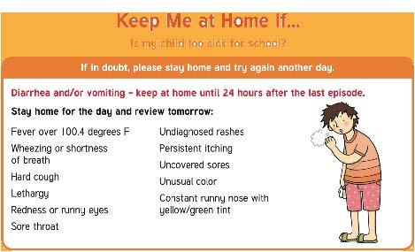 If a child has any symptoms listed below, they should stay home in the morning or go home if these symptoms first occur at school.