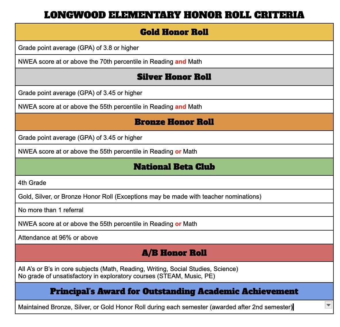 Here at Longwood, we recognize the student Honor Roll after each semester. Below you will find the qualifications for our various Honor Roll levels. Students will be taking the MAP assessment used to determine Honor Roll status. Should you have any questions, please feel free to contact Principal Mayze.