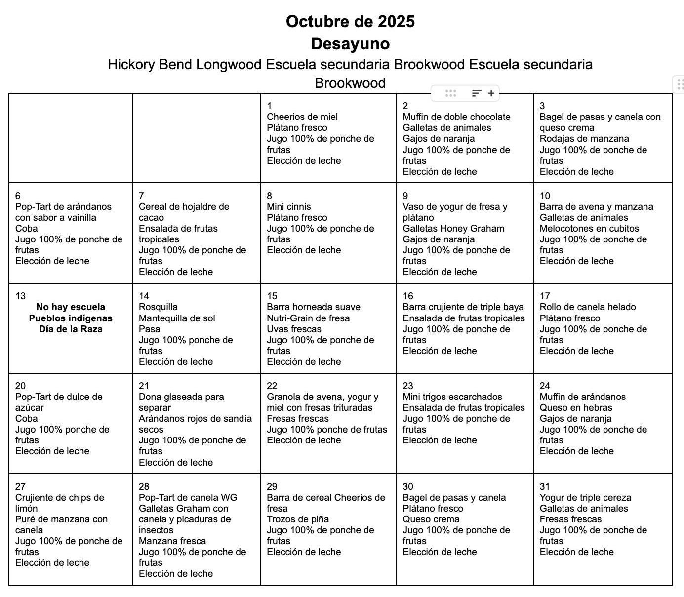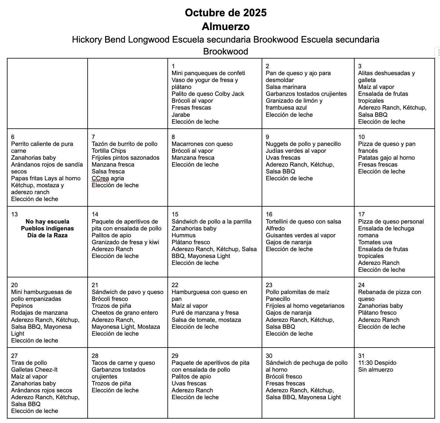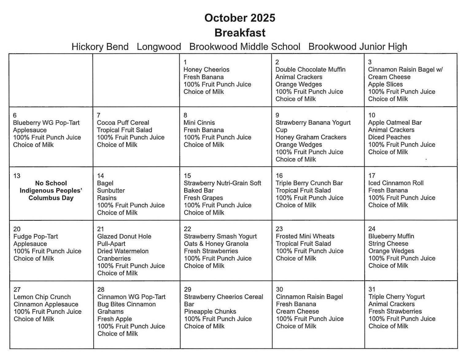 We will be sending home the breakfast and lunch menu for the month of October. We will send home a menu each month so that you will know ahead of time what is being served and plan accordingly.