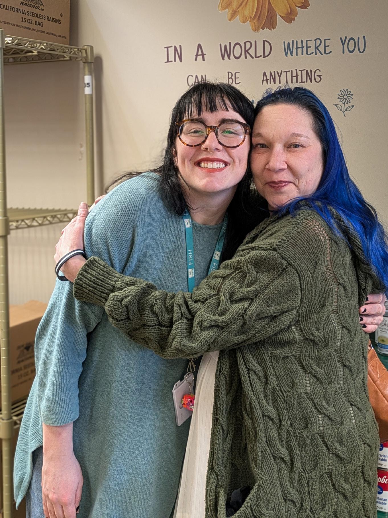 People are so wonderful at FISH. I can’t begin to tell you the true help FISH has given us, honestly. Sometimes it’s just knowing that I can come here. No one’s going to judge me. No one’s going to say, “Oh here she comes again, asking for a handout.” Everyone’s just always been very kind. It’s nice to be acknowledged as a person, and it’s in no way fake.