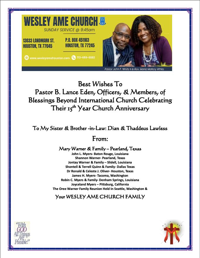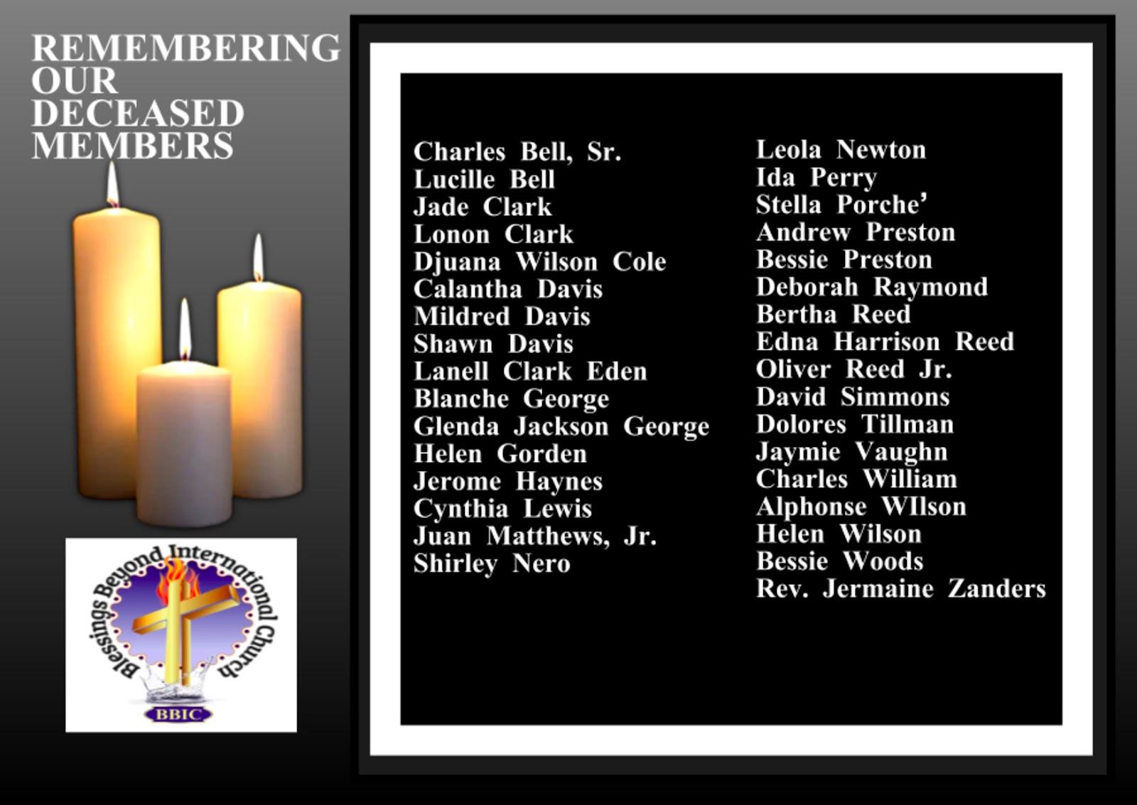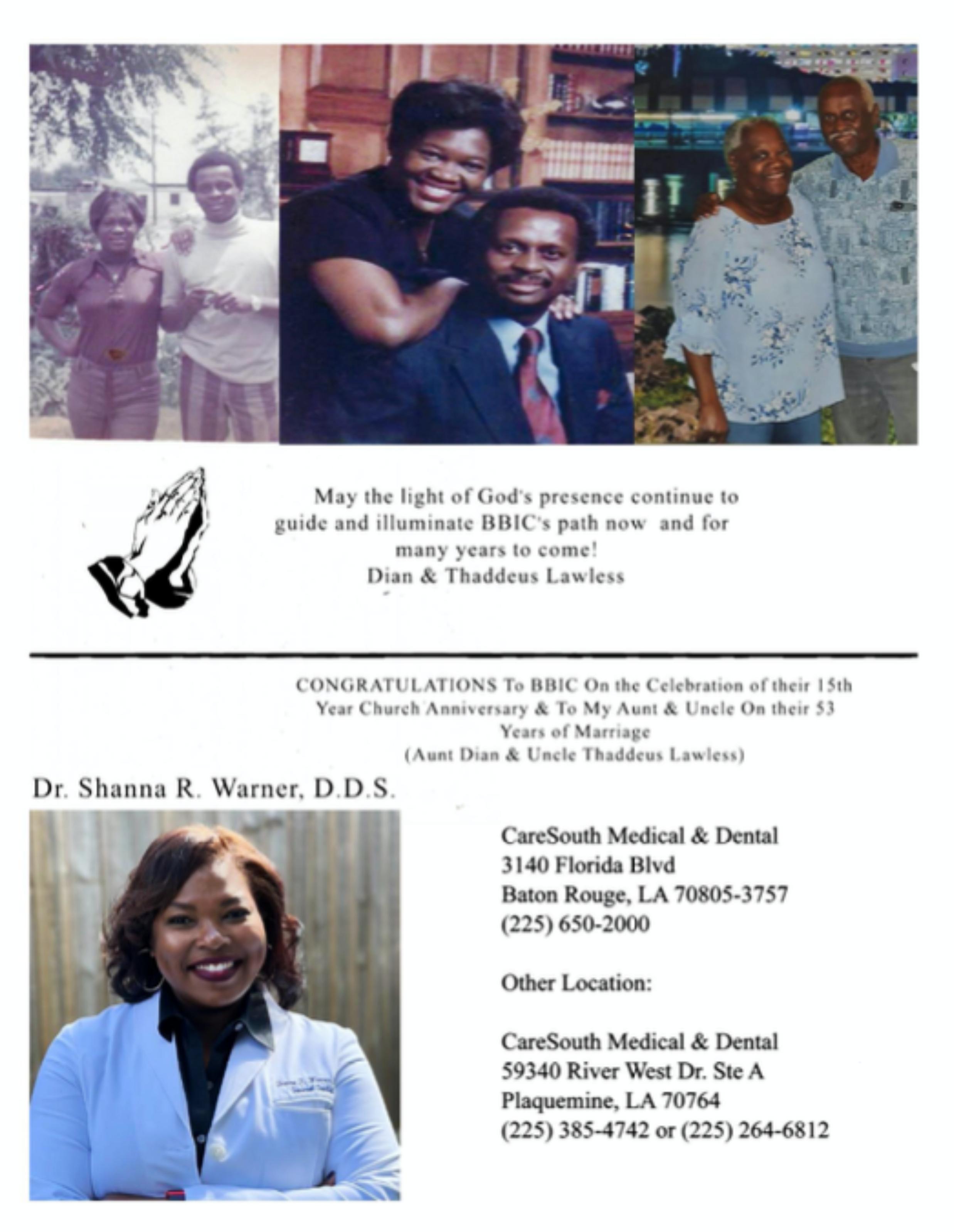 In July our first Vaca on Bible School was planned and implemented by the Communion Steward President, Barbara Oliver It was on Zoom for the en re month VBS was well a ended virtually BBIC 12th Year Church Anniversary was held on Sunday, August 15th at our temporary loca on at Philip Memorial United Methodist Church on 3236 Burde e Street. The Rev. Herbert Brisbon, III Chaplain of Dillard University was the guest preacher for the worship service. We also lost one of our founding members, a mother of BBIC, Mrs Bessie Sims Landry Preston on August 2, 2021 Although we were able to resume some sense of normalcy within our congrega on in 2022, our hearts were extremely saddened by the death of our Associate Pastor, Rev. Jermaine Allen Zanders in April 2022.