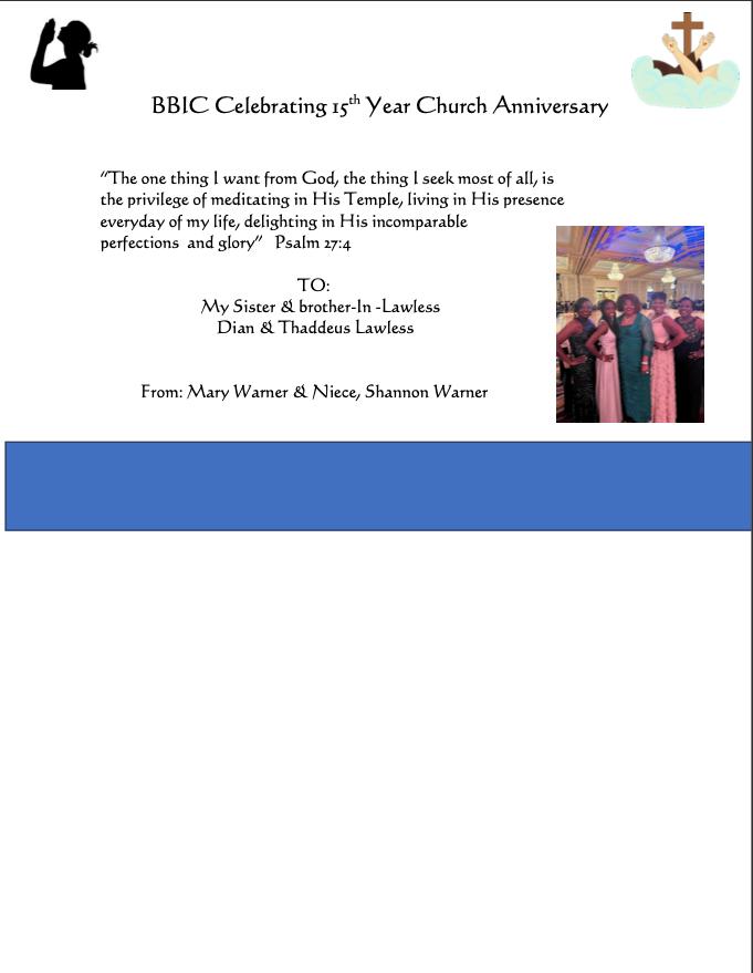 We thank God for our anointed pastor who in 2025 will celebrate 20 years of pastoring, our Minister of Music, Min. Charles McCall and our dedicated musicians, our Board of Directors and each other, the faithful members of BBIC. With God on our side, along with faith, pa ence, prayer and love, we con nue to move forward in the Lord Con nue to pray for us as we dare to be that church that no other church has ever been “Eyes have not seen what the Lord has in store for us ”