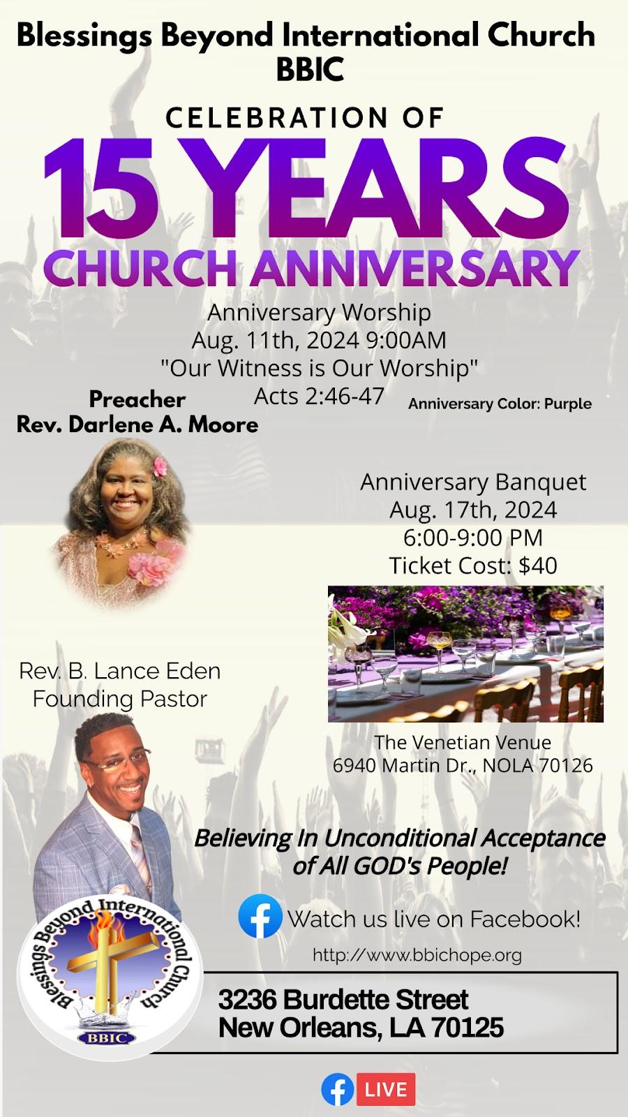 During that same meframe, a group of Chris an leaders and members of First Street PW conceded that the bishop had totally ignored their recommenda ons rela ng to the appointment of the pastor. They individually and collec vely concluded that they could no longer remain loyal to the United Methodist Church Because God tells us to walk by faith and not by sight, this group of Chris an leaders and members of First Street PW met with Rev. Eden, and Blessings Beyond Interna onal Church, be er known as BBIC, was founded and organized on July 28, 2009, and was incorporated on July 31, 2009 BBIC is a name that stands for a unified people with a Godly spirit who are accepted uncondi onally