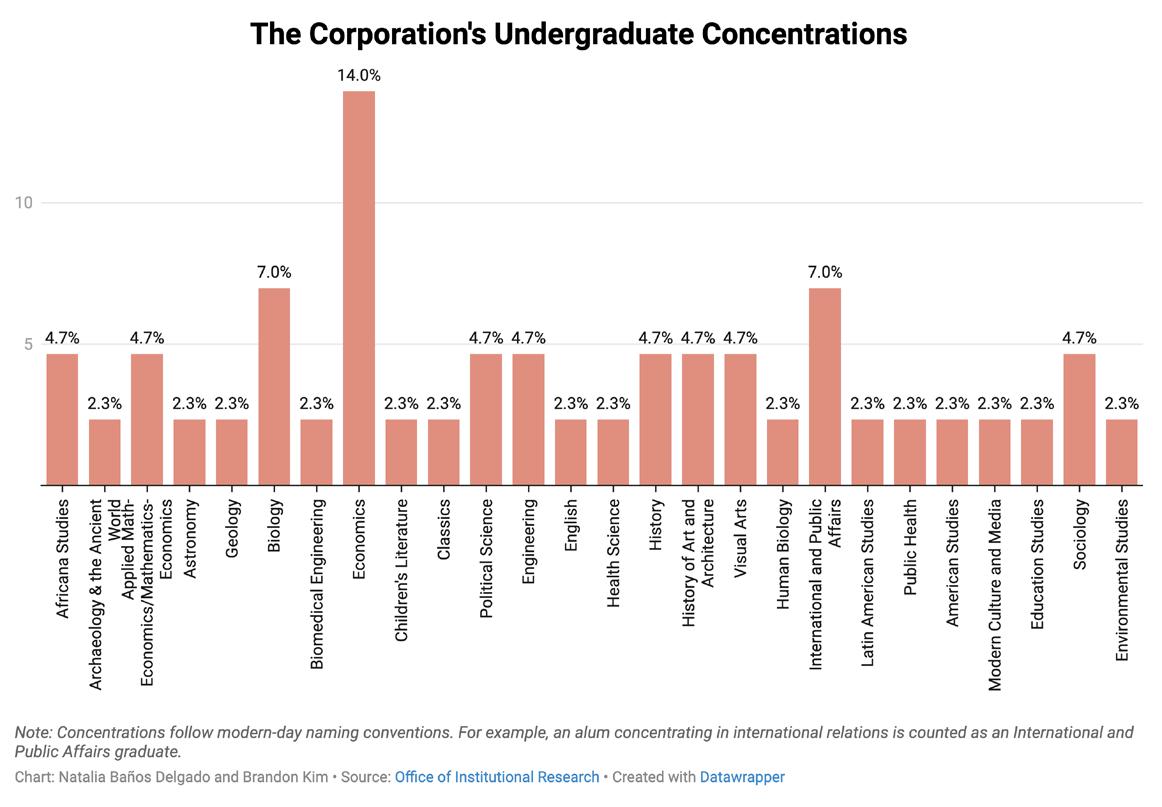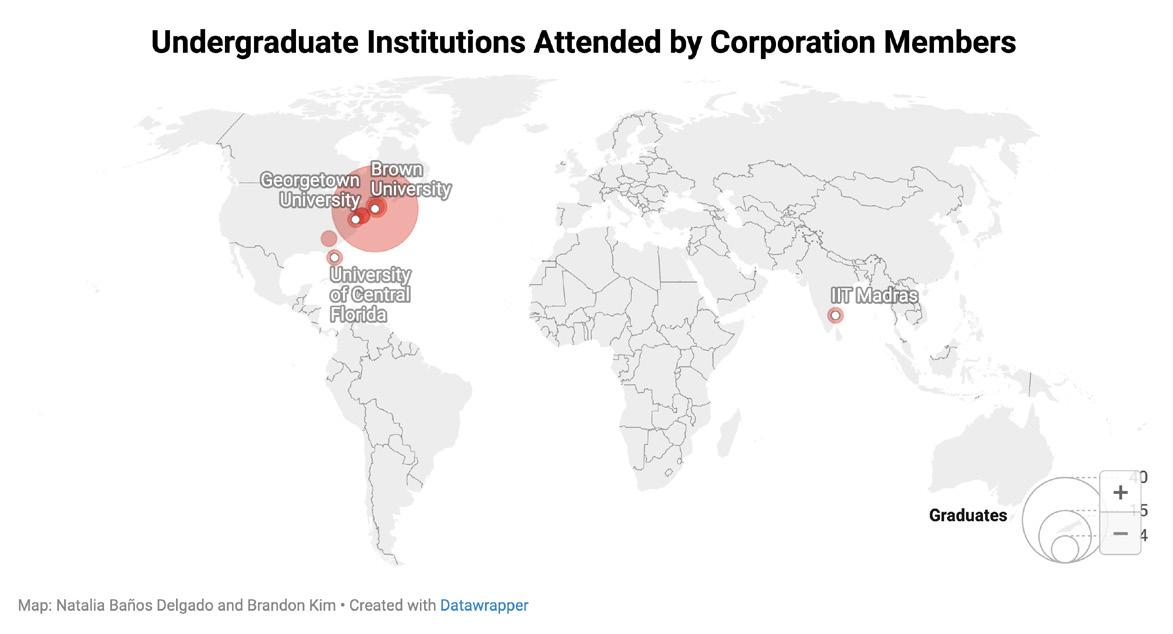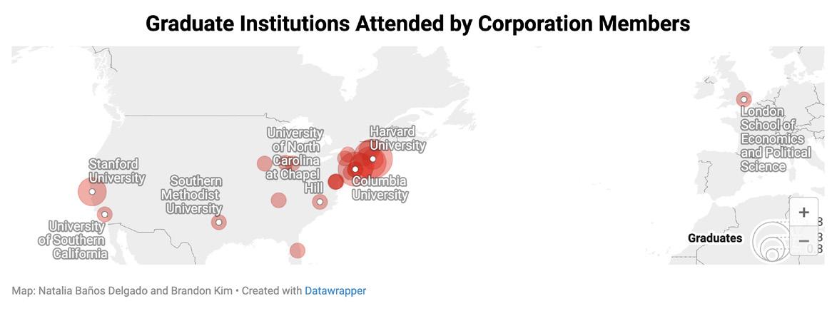 The Herald positively identified 42 corporation members who attended graduate schools. Harvard, Columbia and Brown are the most represented institutions with eight, six and five members receiving a degree from each school, respectively. Seven members did not attend Brown for either undergraduate or graduate studies.