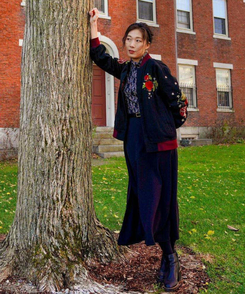 Min’s favorite outfit to wear is a bomber jacket with pomegranates embroidered on it — an item that makes her feel “artsy and quirky.” She recalled how “a woman on the Amtrak offered to buy” the jacket — which was created by an independent artist who runs the brand Morningwitch — off her back.