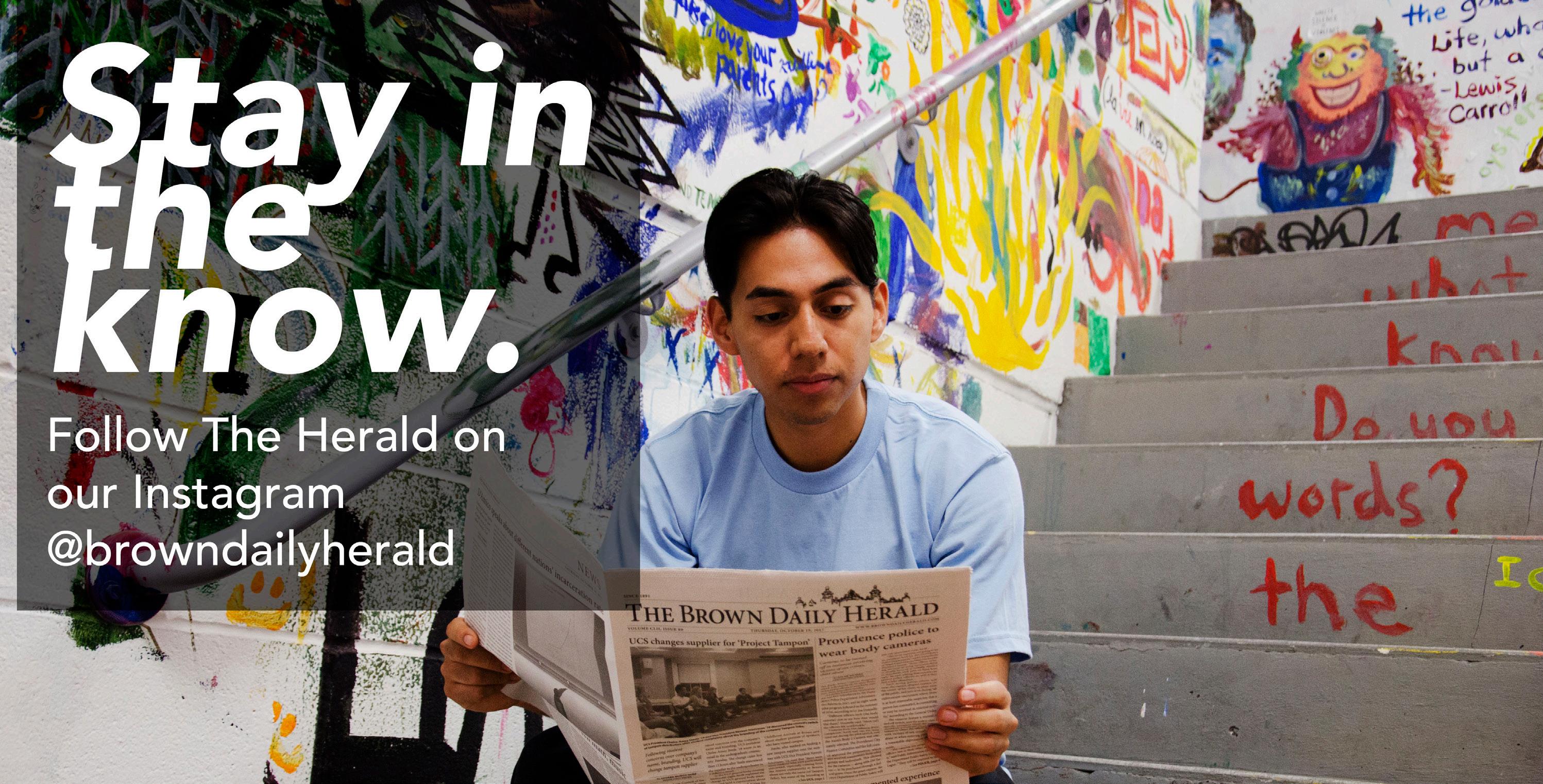 in submissions at least 24 hours in advance of your desired publication date. The Herald only publishes submissions while it is in print. The Herald reserves the right to edit all submissions. If your piece is considered for publication, an editor will contact you to discuss potential changes to your submission. Commentary: The editorial is the majority opinion of the editorial page board of The Brown Daily Herald. The editorial viewpoint does not necessarily reflect the views of The Brown Daily Herald, Inc. Columns, letters and comics reflect the opinions of their authors only. Corrections: The Brown Daily Herald is committed to providing the Brown University community with the most accurate information possible. Corrections may be submitted up to seven calendar days after publication. Periodicals postage paid at Providence, R.I. Postmaster: Please send corrections to P.O. Box 2538, Providence, RI 02906. Advertising: The Brown Daily Herald, Inc. reserves the right to accept or decline any advertisement at its discretion. 6 88 Benevolent, Providence, RI (401) 351-3372 www.browndailyherald.com Editorial: herald@browndailyherald.com Advertising: advertising@browndailyherald.com THE BROWN DAILY HERALD SINCE 1891 @the_herald facebook.com/browndailyherald @browndailyherald @browndailyherald 132nd Editorial Board Editor-in-Chief Ben Glickman Managing Editors Benjamin Pollard Caelyn Pender Senior Editors Katie Chen Gaya Gupta Jack Walker post-magazine Editor-in-Chief Kyoko Leaman News Metro Editors Emma Gardner Ashley Guo Oliver Kneen Katy Pickens Sameer Sinha Science & Research Editors Kathleen Meininger Gabriella Vulakh Arts & Culture Editors Rebecca Carcieri Laura David Aalia Jagwani Sports Editor Peter Swope University News Editors Emily Faulhaber Will Kubzansky Caleb Lazar Alex Nadirashvili Stella Olken-Hunt Shilpa Sajja Kaitlyn Torres Digital News Director of Technology Jed Fox Opinions Editorial Page Board Editor Johnny Ren Head Opinions Editor Augustus Bayard Opinions Editor Anika Bahl Bliss Han Melissa Liu Jackson McGough Alissa Simon Multimedia Illustration Chief Ashley Choi Photo Chiefs Danielle Emerson Julia Grossman Photo Editors Elsa Choi-Hausman Mathieu Greco Rocky Mattos-Canedo Dana Richie Social Media Chief Alejandro Ingkavet Social Media Editors Julian Beaudry Sahil Balani Kaiolena Tacazon Production Copy Desk Chief Lily Lustig Assistant Copy Desk Chief Brendan McMahon Design Chief Raphael Li Design Editors Sirine Benali Maddy Cherr Julia Grossman Gray Martens Neil Mehta Business General Managers Alexandra Cerda Sophie Silverman Andrew Willwerth Sales Directors Joe Belfield Alexander Zhou Finance Director Eli Pullaro RESEARCH