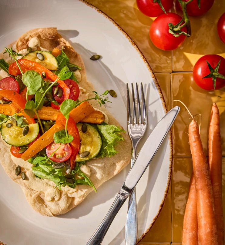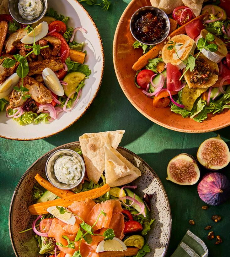 Our salads with salmon and roast chicken are served with pinsa and herb spread.