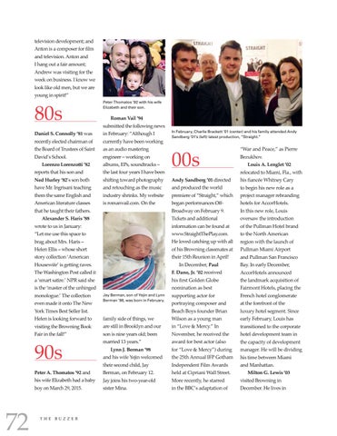 In February, Charlie Brackett ’01 (center) and his family attended Andy Sandberg ’01’s (left) latest production, “Straight.”