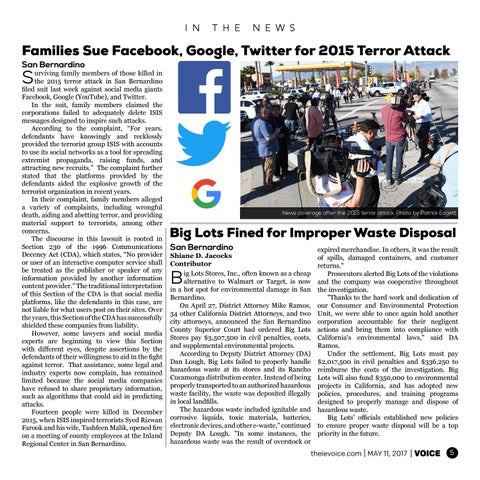 urviving family members of those killed in the 2015 terror attack in San Bernardino filed suit last week against social media giants Facebook, Google (YouTube), and Twitter. In the suit, family members claimed the corporations failed to adequately delete ISIS messages designed to inspire such attacks. According to the complaint, “For years, defendants have knowingly and recklessly provided the terrorist group ISIS with accounts to use its social networks as a tool for spreading extremist propaganda, raising funds, and attracting new recruits.” The complaint further stated that the platforms provided by the defendants aided the explosive growth of the terrorist organization in recent years. In their complaint, family members alleged a variety of complaints, including wrongful death, aiding and abetting terror, and providing material support to terrorists, among other concerns. The discourse in this lawsuit is rooted in Section 230 of the 1996 Communications Decency Act (CDA), which states, “No provider or user of an interactive computer service shall be treated as the publisher or speaker of any information provided by another information content provider.” The traditional interpretation of this Section of the CDA is that social media platforms, like the defendants in this case, are not liable for what users post on their sites. Over the years, this Section of the CDA has successfully shielded these companies from liability. However, some lawyers and social media experts are beginning to view this Section with different eyes, despite assertions by the defendants of their willingness to aid in the fight against terror. That assistance, some legal and industry experts now complain, has remained limited because the social media companies have refused to share proprietary information, such as algorithms that could aid in predicting attacks. Fourteen people were killed in December 2015, when ISIS inspired terrorists Syed Rizwan Farook and his wife, Tashfeen Malik, opened fire on a meeting of county employees at the Inland Regional Center in San Bernardino.