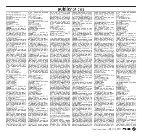 Et Seq., Business and Professions Code). Larry W. Ward, County, Clerk Clerk A. RIBAU FILE NO. R-2013-07072 p. 7/18, 7/25, 8/1, 8/8, 2013 ______________________ The following person(s) is (are) doing business as: ENLIGHTEN TUTORING ENLIGHTENED HEALTH 3406 Iowa Ave., Apt. C Riverside, CA 92507 Riverside County Danya Akram Milbes 3406 Iowa Ave., Apt. C Riverside, CA 92507 This business is conducted by: Individual Registrant has not yet begun to transact business under the fictitious name(s) listed above. I declare that all the information in this statement is true and correct. (A registrant who declares as true, information which he or she knows to be false is guilty of a crime.) s/…Danya A. Mibles The filing of this statement does not of itself authorize the use in this state of a fictitious business name in violation of the rights of another under federal, state, or common law (sec. 1440 et. seq. b &p code) Statement filed with the County of Riverside on 7/01/13 I hereby certify that this copy is a correct copy of the original statement on file in my office. NOTICE: This fictitious business name statement expires five years from the date it was filed in the Office of the County Clerk. A new Fictitious Business Name Statement must be filed before that time. The filing of this statement does not itself authorize the use in this state of a Fictitious Business Name in violation of the rights of another under federal, state or common law (See Section 14411, Et Seq., Business and Professions Code). Larry W. Ward, County, Clerk Clerk B. HARRIS FILE NO. R-2013-06913 p. 7/18, 7/25, 8/1, 8/8, 2013 ______________________ The following person(s) is (are) doing business as: PARTS R US 9730 Arlington Ave. Riverside, CA 92504 Riverside County 6679 Palm Ave. Apt. M Riverside, CA 92506-2364 Enrique – Trejo 6679 Palm Ave., Apt. M Riverside, CA 92506 This business is conducted by: Individual Registrant has not yet begun to transact business under the fictitious name(s) listed above. I declare that all the information in this statement is true and correct. (A registrant who declares as true, information which he or she knows to be false is guilty of a crime.) s/…Enrique Trejo The filing of this statement does not of itself authorize the use in this state of a fictitious business name in violation of the rights of another under federal, state, or common law (sec. 1440 et. seq. b &p code) Statement filed with the County of Riverside on 7/01/13 I hereby certify that this copy is a correct copy of the original statement on file in my office. NOTICE: This fictitious business name statement expires five years from the date it was filed in the Office