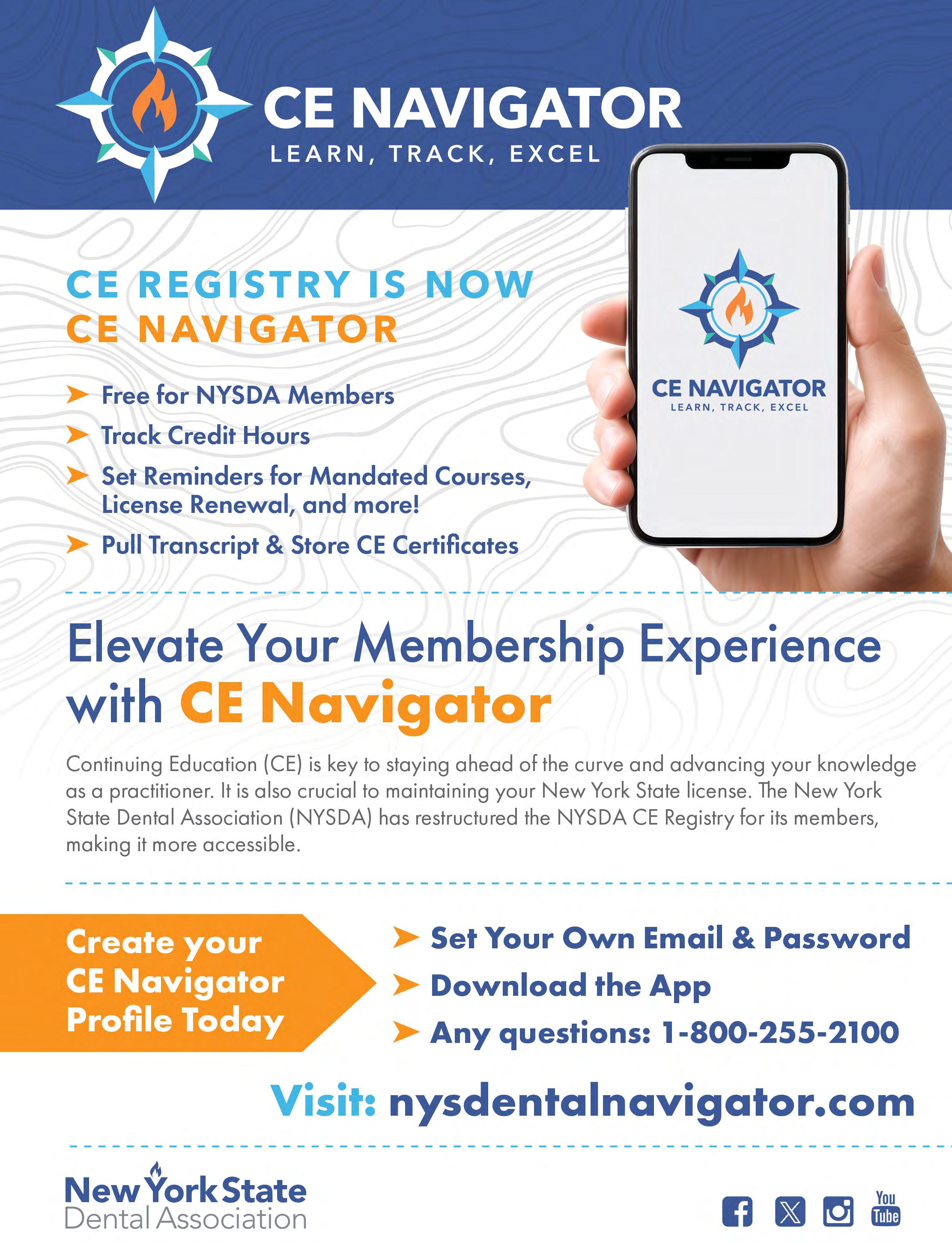 The NYSDA News (ISSN 1531684X) is published quarterly, in February, May, October and December by the New York State Dental Association, Suite 602, 20 Corporate Woods Boulevard, Albany, NY 12211-2370. It is available in digital form only and accessible online in the members-only section of the NYSDA website, www.nysdental.org, under publications.