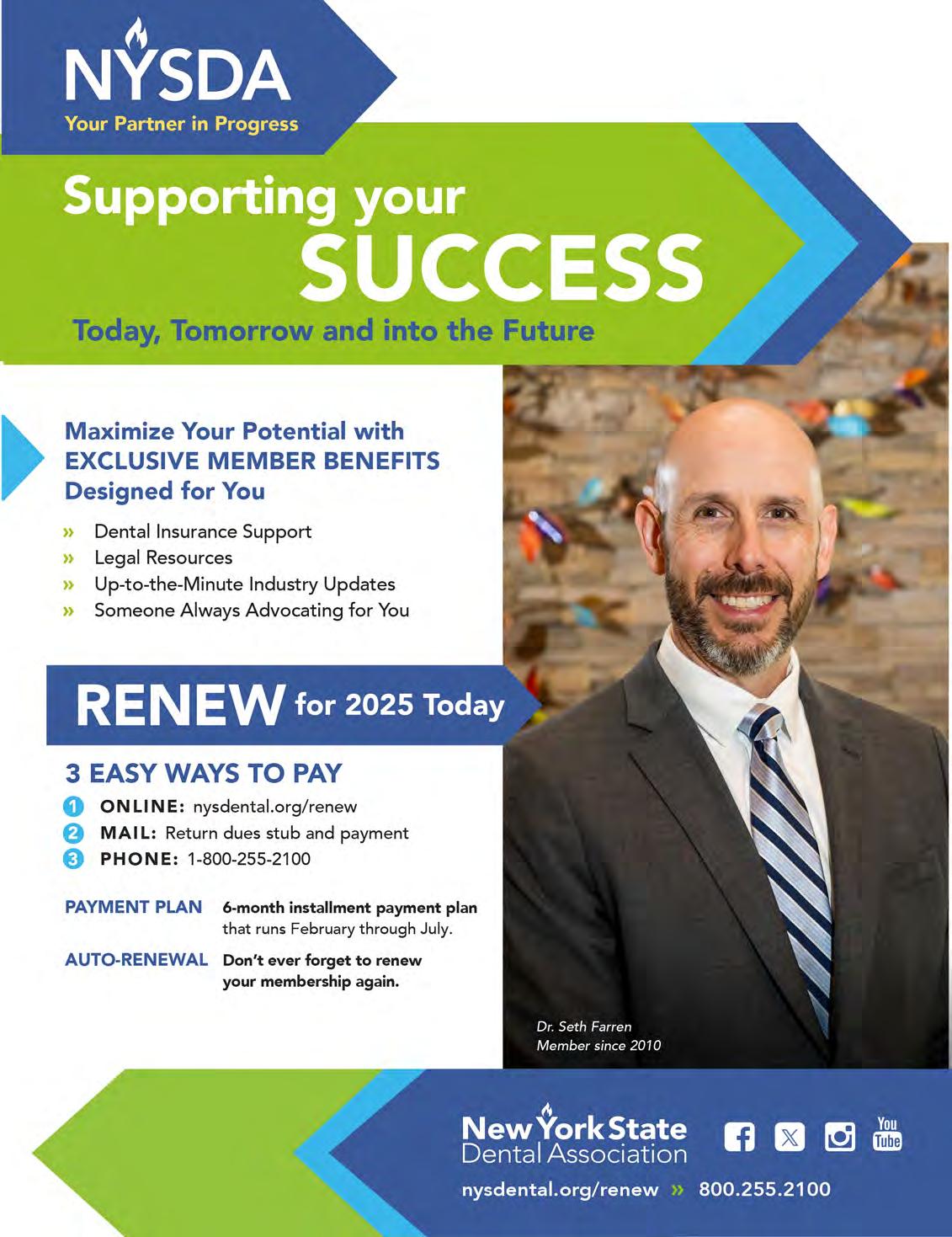 Currently, NYSDA is in the process of reviewing the merits of joining the Dentist and Dental Hygienist Compact, which allows dentists and dental hygienists in other states to practice in New York State. The compact has been accepted so far in 10 states: Washington, Colorado, Kansas, Minnesota, Wisconsin, Iowa, Ohio, Tennessee, Virginia and Maine. Fifteen states have bills moving forward to join). Compact Map – Dentist and Dental Hygienist Compact (ddhcompact.org). Dr. Linda Edgar, immediate past president of the ADA, said “…The compact will help alleviate workforce challenges in these states and in states that join in the future.”[5]