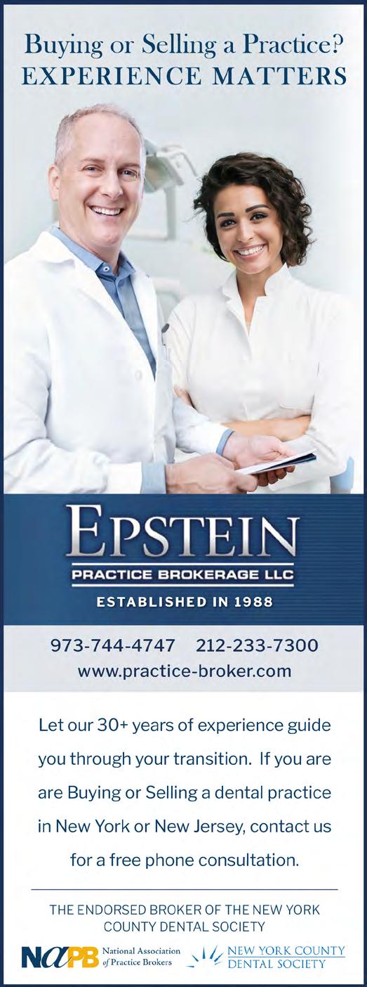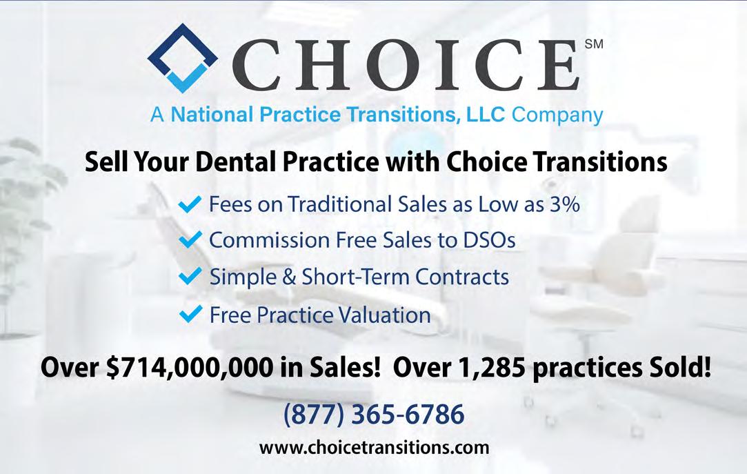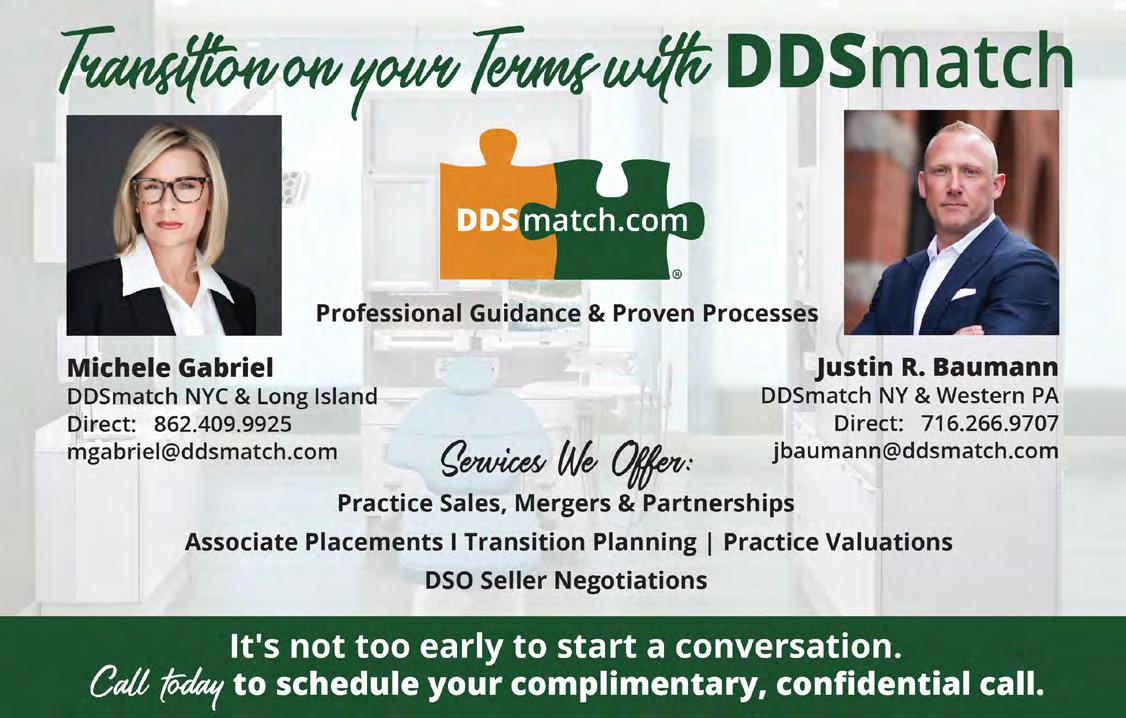 CENTRAL NEW YORK: Established general dental practice offers strong community ties, consistent demand and long-term stability. Owner doctor practicing more than 15 years and seeks partnership. Recently updated office features nine operatories with additional expansion space available for lease. Operating just four days per week. Practice supports 2,815 active patients and generates $2.248M collections with $815K in EBITDA. Minimal advertising and steady word-of-mouth referrals create meaningful growth potential. Learn more by contacting Bailey, Professional Transition Strategies by email: bailey@ professionaltransition.com; or call (719) 694-8320. Ref #NY112625. Online here: www. professionaltransition.