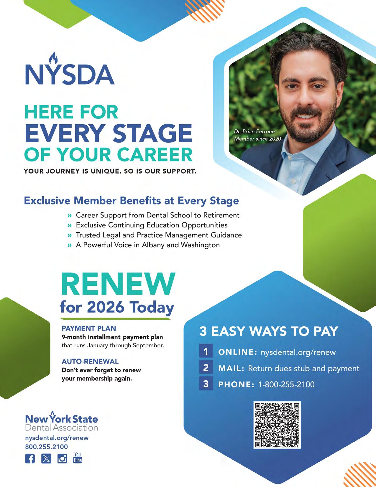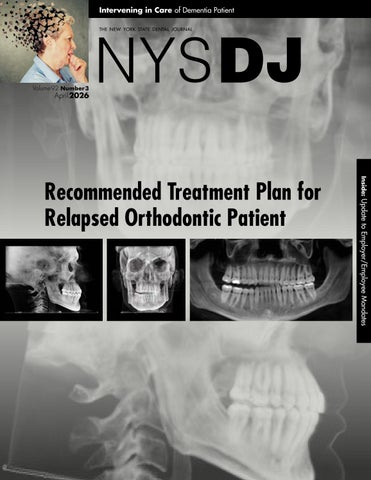 NYSDJ (ISSN 0028-7571) appears two times a year in print: January and June/July. The March, April, August/September and November issues are available online only at www.nysdental.org. The Journal is a publication of the New York State Dental Association, 20 Corporate Woods Boulevard, Suite 602, Albany, NY 12211. In February, May, October and December, members have online access to the NYSDA News. Subscription rates for nonmembers: $75 per year or $12 per issue, U.S. and Canada; $135 per year foreign or $22 per issue. Editorial and advertising offices are at Suite 602, 20 Corporate Woods Boulevard, Albany, NY 12211. Telephone (518) 465-0044. Email info@nysdental.org. Website www.nysdental.org.