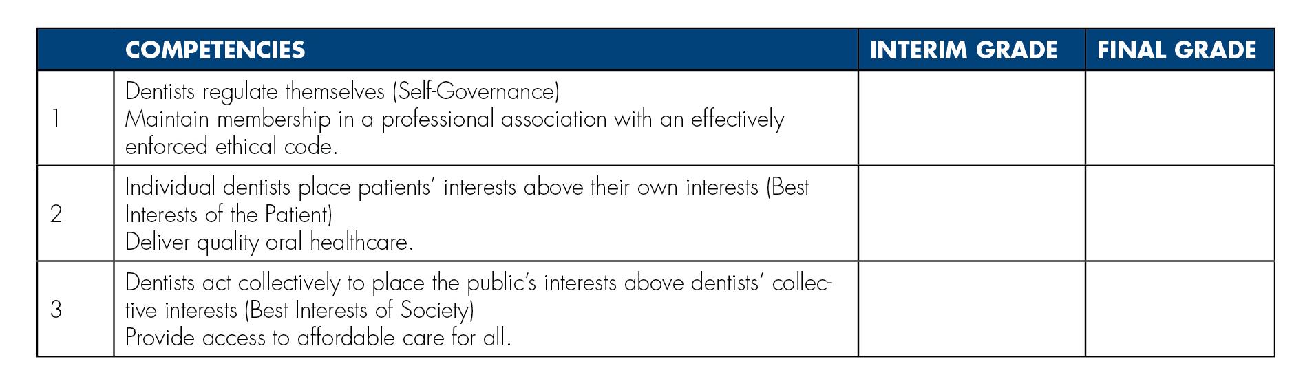 autonomy gave us the wrong impression. In fact, society continues to assess dentists’ ongoing performance related to three core competencies and performance criteria as described in the report card below.