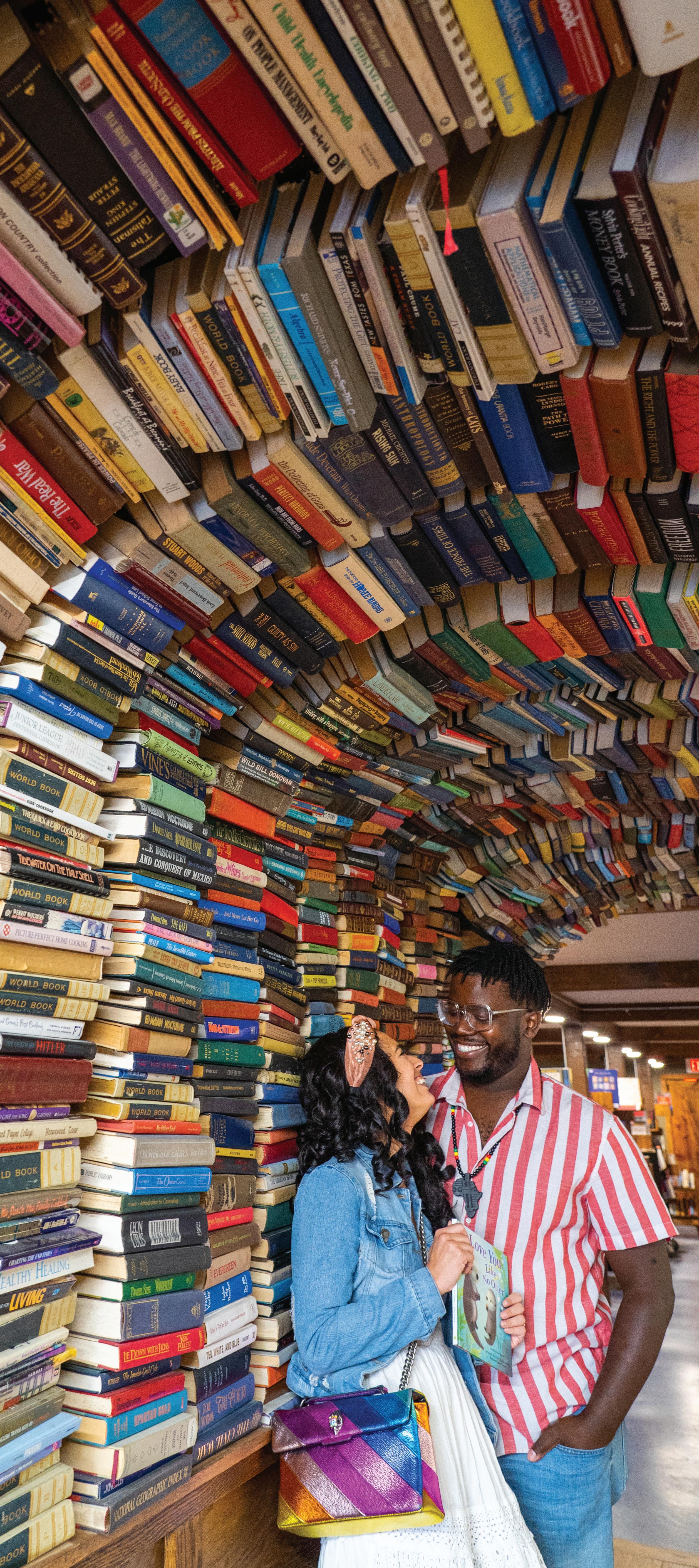 Intermission Bookshop is an independent bookstore located in downtown Brownwood, Texas. During World War II, this building served as the Queen Theater. Silhouettes on the walls reveal profiles from where soldiers would rest their heads. Fully renovated, this store is now home to gently used and new books. What sets this book shop apart is the famous book arch that greets you as you walk in. This is a space to find a new book to read, make new friends, and where real stories are shared!