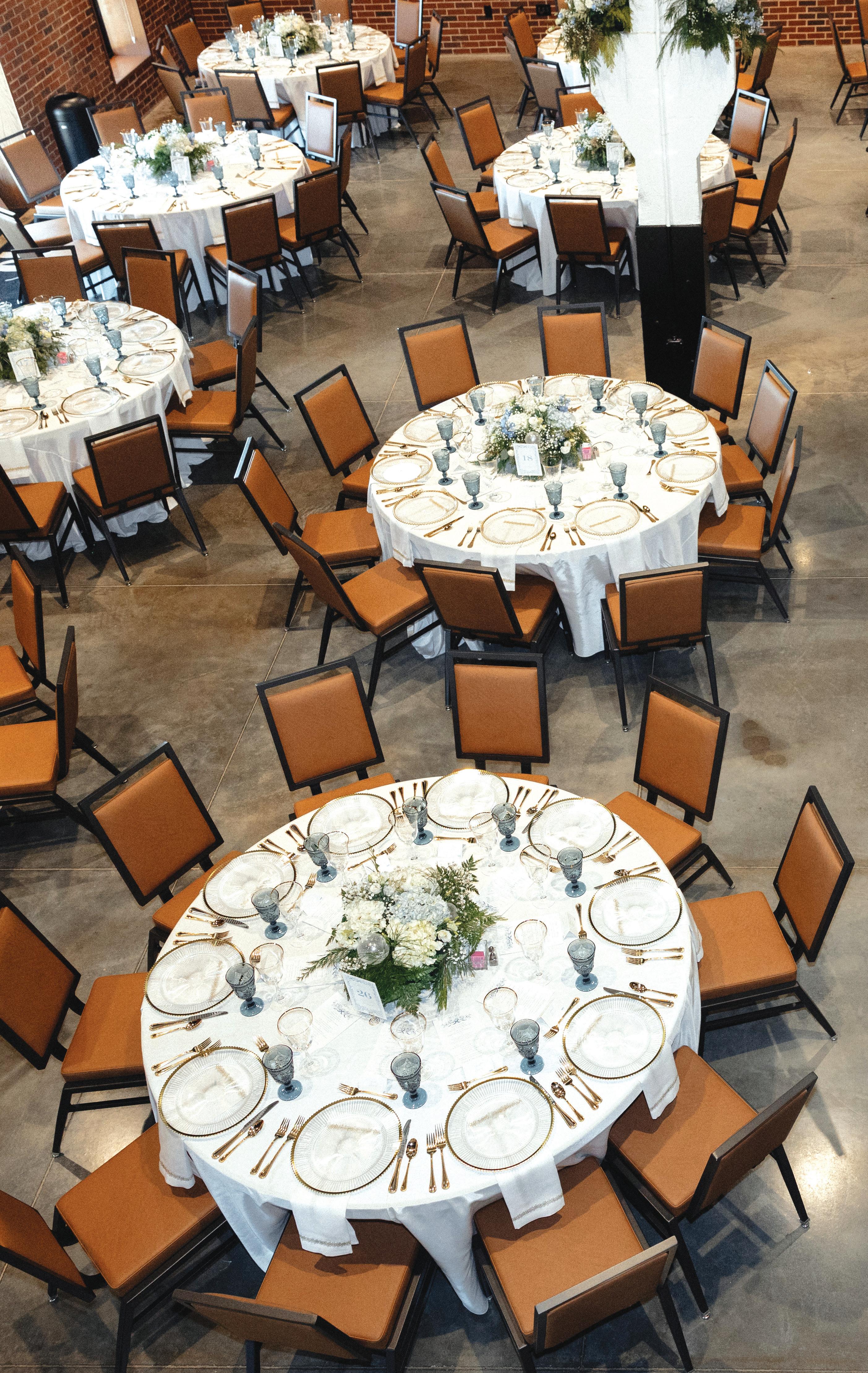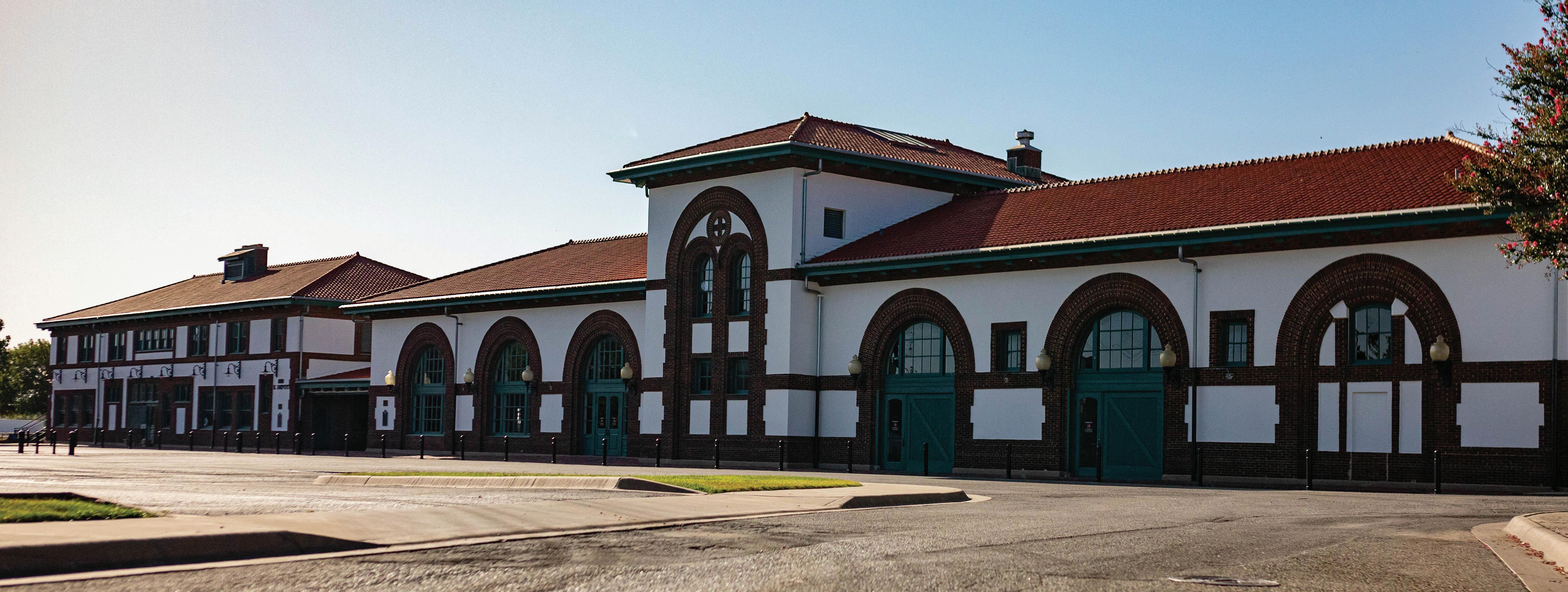 Originally built in 1909, this Santa Fe Depot has been impeccably renovated to create elegant spaces that are ideal for weddings. The space’s expansive ballroom is a luminous space brimming with timeless sophistication and traditional Southern hospitality. Sky high ceilings, wood wall finishes, and exposed brick harken to the building’s past, adding a sense of historic charm to this one-of-a-kind space. Huge archshaped windows with bright white frames welcome in the natural light, illuminating the room and bringing out the warm color tones in the woods and paints.