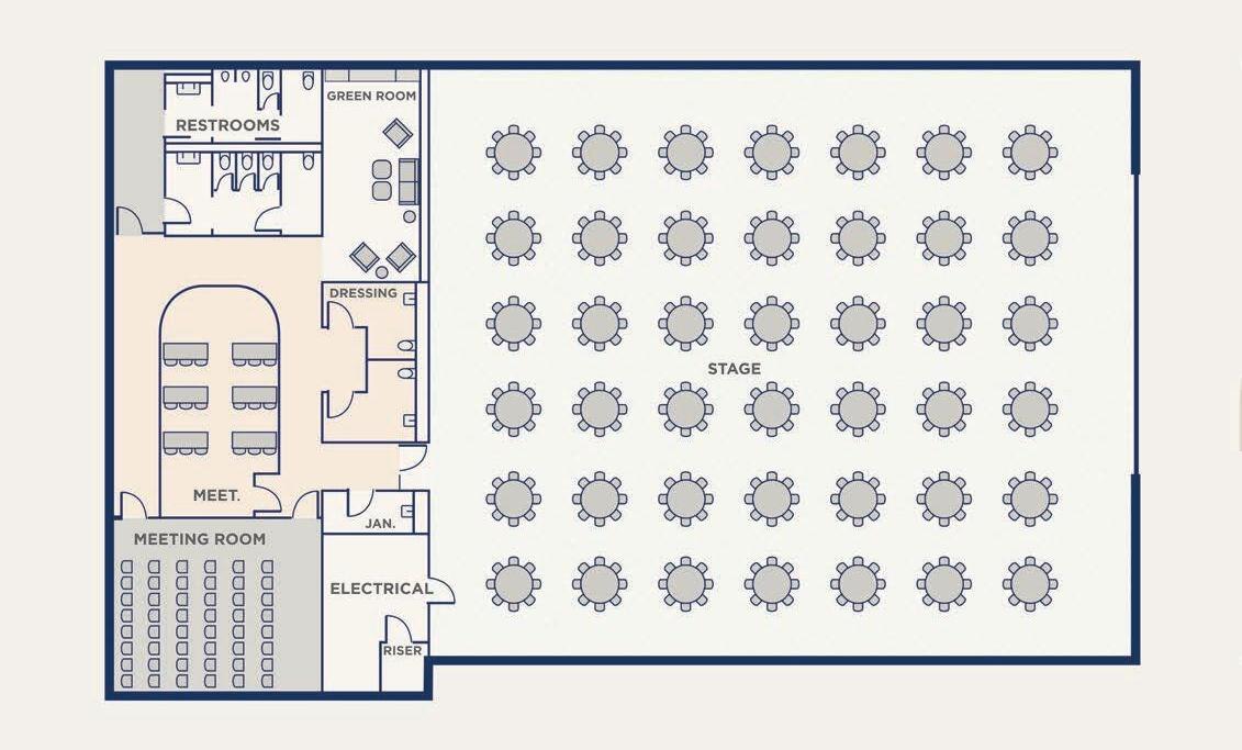 The Mayes Room offers 378 square feet of space perfect for a training session with classroom sets or VIP Lounge for concert events. When staged with cocktail tables, the Mayes Room can hold 65 people.