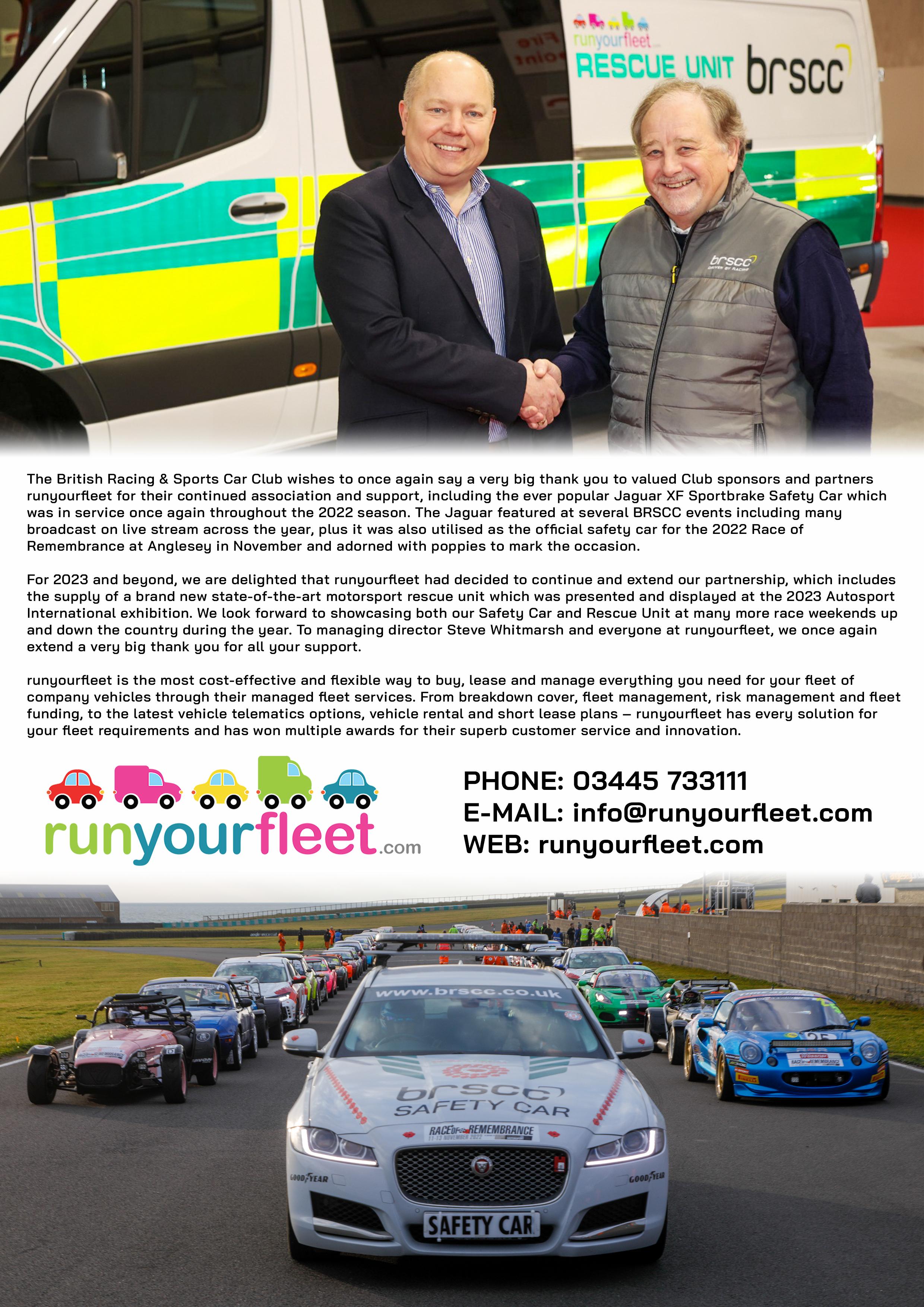 I am also thankful once again for all of the supporting sponsors that we feature in this latest edition of the Yearbook. A big thank you goes to George Grant of Clapham North MOT and Downforce Radio for his continued support as well as the following partners and advertisers: MSV, TSL Timing, Cooksport Performance, SW Motorsports, Grove & Dean, The Motorsports School, BC Racing, Adrian Flux and Dalys Systems. Alongside this, I also say thank you for the continued support of our partners at runyourfleet, who supplied our superb Jaguar safety car and more recently a brand new state-of-the-art motorsport rescue unit to the Club. To Steve Whitmarsh and all at runyourfleet, your continued partnership with us is very much valued.