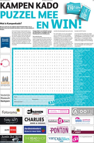 Ben je op zoek naar een origineel cadeau? Kampen Kado is een cadeaubon die je kunt besteden bij winkels, horeca en andere plekken in Kampen. Kampen Kado is een initiatief van kamJe kunt de Kampen Kado besteden bij onpen Marketing en verkrijgbaar bij The der andere winkels en horeca in hartelijke Hanzestad Kampen. Het aanbod is divers: Readshop Bos en de Stadskazerne. een etentje, T-shirt of liever een lijst voor Hoe werkt de actie: een nieuw schilderij, een paar schoenen, In de puzzel staan alle deelnemende winsokken, tas of een mooi sieraad. Alles keliers, aangevuld met andere woorden in kan! Door de brede besteedbaarheid kan de puzzelactie. Streep alle namen van de je altijd een inleverpunt naar jouw smaak winkeliers weg en de overgebleven letters vinden. De kadobon is geldig tot en met de datum die op de achterzijde van de bon vormen een of meerdere woorden. Na vier puzzels (4 weken lang wordt er een puzzel is vermeld. geplaatst) vormen deze overgebleven