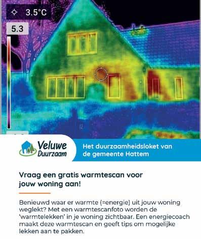 Met een warmtescanfoto worden de ‘warmtelekken’ in je woning zichtbaar. Een energiecoach maakt deze warmtescan en geeft tips om mogelijke lekken aan te pakken. Vraag de scan aan vóór 31 december via www.veluweduurzaam. nl/aanmelden-warmtefoto
