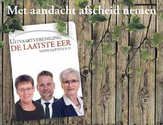 • R.K. Kerk O.L.V. ten Hemelopneming: zondag 2 oktober 9.00 uur Eucharistie • Vrijzinnig Hattem/Heerde; zondag 2 oktober Anja van de Poppe, Harderwijk • Kapeldiensten De Hezenberg; 10.00 – 11.00 uur viering in de kapel. Belangstellenden van buitenaf kunnen zich tot uiterlijk 12.00 uur op de vrijdag voor de viering aanmelden via info@hezenberg.nl Rooster Zendtijd voor Kerken: zondag 2 oktober GKV Gasthuiskerk. KERKDIENSTEN COLOFON De Hattemer is een uitgave van Uitgeverij Hattem BV Redactie: Angela van Erven, Corinda van der Worp, Marloes Geertsma redactie@dehattemer.nl Verkoop advertenties: John Marsman, verkoop@dehattemer.nl Opmaak: JM Reclamedia Bezoekadres: 2e Walsteeg 4 in Hattem Deadline redactie: maandag 8.00 uur, Advertenties: maandag 10.00 uur Familieberichten: dinsdag 10.00 uur via verkoop@dehattemer.nl VRIENDEN VAN DE HATTEMER Wilt u er een steentje aan bijdragen dat Hattems nieuws iedere week bij u op de deurmat kan vallen, dan kunt u een bijdrage storten op dit bankrekeningnummer NL87 RABO 0350 5238 00 t.n.v. Vrienden van de Hattemer. De opbrengst komt geheel ten goede aan de realisatie van de krant.Voor meer informatie: redactie@dehattemer.nl Familieberichten www.alphanatuursteen.nl ALPHA NATUURSTEEN Dé steenhouwer in uw regio Kwaliteit van nu en ser vice van toen Nijkerk T (033) 245 08 05 E info@alphanatuursteen nl ‘t Harde T (0525) 65 57 04 E tharde@a phanatuursteen nl Epe T (0578) 61 73 17 E epe@alphanatuursteen nl Harderwijk T (0341) 23 05 70 E harderwi k@alphanatuursteen nl Uitvaartverzorging op basis van Noaberschap, “van elkaar met elkaar”, voor iedereen Meldnummer bij overlijden: 038 - 444 04 74 Secretariaat: 038 - 337 79 64 secr@uitvaart-dle-hattem.nl www.uitvaart-dle-hattem.nl