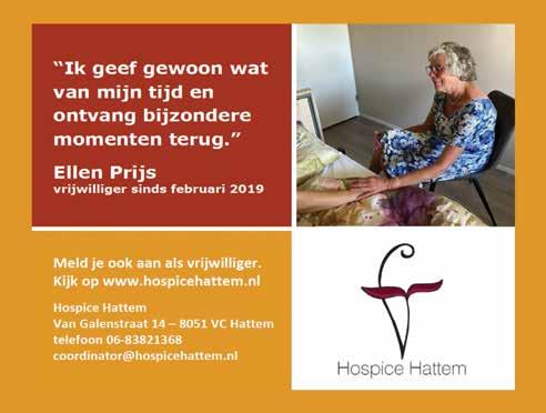 Naast de praktische ondersteu ning die de vrijwilligers bieden, zijn aandacht, gewoon een kopje thee drinken en een praatje ma ken ook heel belangrijk voor me de-Hattemers.