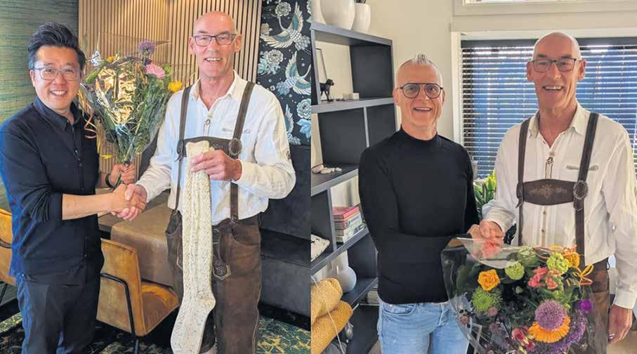 de foto links Terrence Ip van Kota Radja samen met voorzitter Anton ten Have. Op de foto rechts Marco Hoogers van Hordal B.V. samen met voorzitter Anton ten Have.