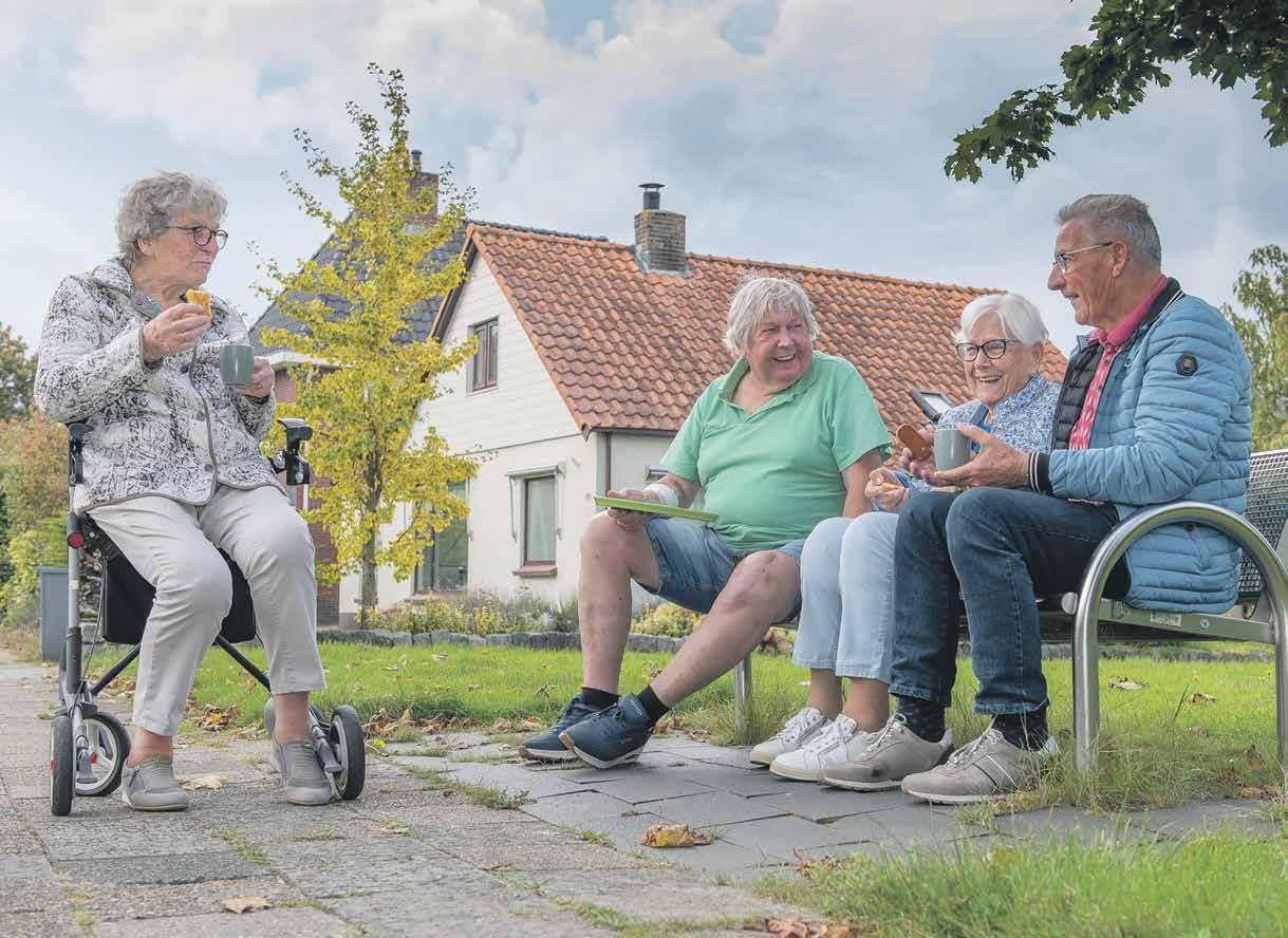 de, op en bij het bankje op de foto. Ik liep naar huis, haalde mijn fototoestel op om een foto van het leuke tafereel te maken. En net toen ik er was, kwam de overbuurman Piet Fiet zomaar koffie en een koek brengen. Een mooi voorbeeld van noaberschap en ‘buren’ zijn!”
