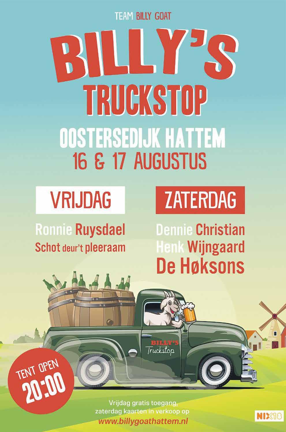 HATTEM – Op vrijdag 16 en zaterdag 17 augustus vindt de twaalfde editie van Billy Goat plaats in de tent aan de Oostersedijk in Hattem. Dit jaar heeft het feest de naam Billy’s Truckstop gekregen.