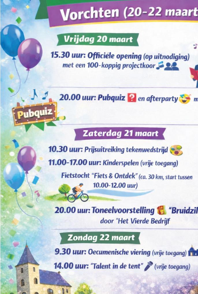 20 maart van 15.30 tot 16.30 uur (inloop vanaf 15.00 uur). Locatie: Feesttent bij de kerk in Vorchten (Kerkweg 17, Vorchten).