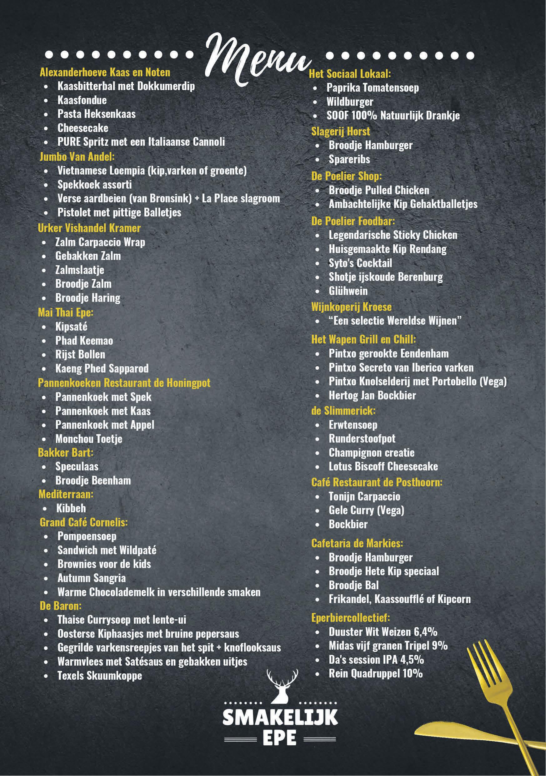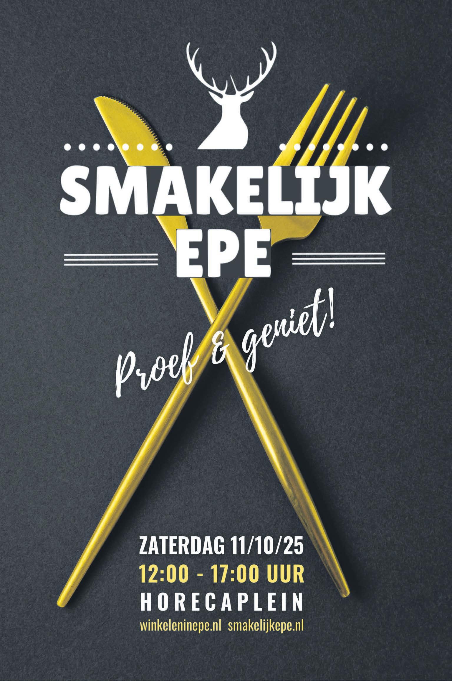 EPE- Op zaterdag 11 oktober vindt de 14e editie van Smakelijk Epe plaats, dit jaar op het Horecaplein in Epe. Het Gruttersplein blijkt te krap te worden, en daarom verhuist het evenement naar d plek waar de meeste horecagezelligheid samenkomt. Vanaf 12.00 uur laten lokale ondernemers je kennismaken met een breed scala aan smakelijke proeverijen. Of je nu houdt van hartig of zoet, warm of koud. Denk aan wild, zoete en hartige gerechten en ver jnde lekkernijen van de speciale menukaart.