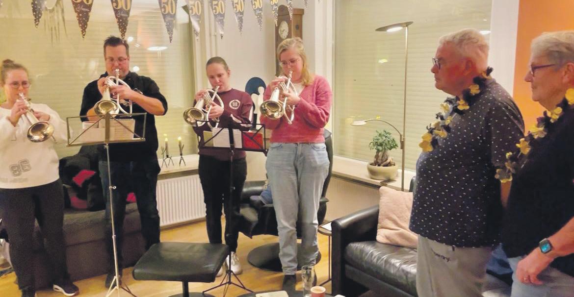 Op vrijdag 28 november waren Roelof en Ada van der Hoeve uit Heerde 50 jaar getrouwd. Roelof en Ada zijn allebei muzikant bij Soli Deo Gloria in Heerde. Sterker nog, ze spelen allebei hetzelfde instrument, namelijk bugel. Daarom kwamen afgelopen donderdag acht leden van de bugelsectie ter ere van dit bijzondere jubileum een muzikale serenade brengen. Tijdens de avond