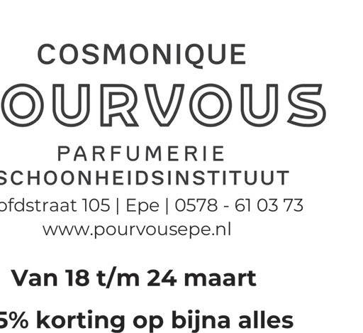 uit te kijken! Professionele modellen zullen de laatste modetrends showen van de volgende winkels uit Epe: HEMA, Shoeby, What’sNew Fashion, Markt., MS mode (nieuw op zaterdag), Sisters in Lingerie, Sweet&Crazy (nieuwkomer op de catwalk), Wedo Mode en MOON. De accessoires komen van Fokke Fennema Sieraden, Huijssoon, Robert Bos, Pearle en FleurInn. Dit keer met twee mannelijke modellen. De kapsels van de modellen worden verzorgd door Ami kappers en Haarstudio TopChic en de make-up door PourVous. Op zondag 2 maart om 13.00 uur, �jdens koopzondag, kunt nog een keer genieten van een modeshow en wel op het horecaplein. Dan laten de eigen modellen van HEMA, Shoeby, What’sNew Fashion, Markt., MS mode, Sisters in Lingerie, Sweet&Crazy, TerStal mode en Shop4Nop de nieuwste modetrends zien. “Dus wie zaterdag niet kan of de modeshow hee� gemist, kan op zondag de modeshow meepikken. Dat was vorig jaar ook goed bevallen, we kregen leuke reac�es en het was lekker druk. De