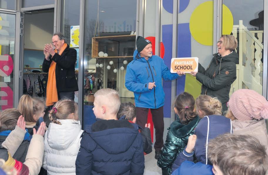 bord.” Wethouder Klaas Harink is blij dat Kristal de tweede fairtradeschool in de gemeente Heerde is. “Dat jullie school daar aan mee wil werken, vind ik top! Ik hoop dat meer scholen fairtradeschool worden, maar dan moeten ze ook goed hun best doen net als jullie school.” Marijke Doetjes was erg blij met de uitreiking van het bord. “Dit is best bijzonder, jullie gaan hier nog veel meer over zien”, liet ze de leerlingen weten.