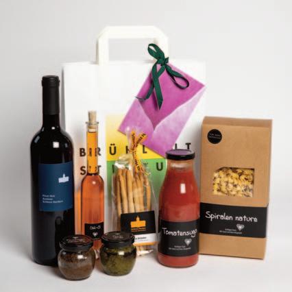Schaumwein (75 cl), Himbeer-Essig (110 g), URDinkel-Apéro-Cracker (150 g), Kräutersalz (90 g), Brühlgut-Guetzli (190 g), Sugo arrabiata (500 g), Gletscherhüetli (400 g), Feuriger Kichererbsen-Dip (90 g), Feigen-Senf (90 g), Karte A6
