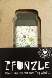 Die Lampe besteht aus dem leichten «Pfunzle»-Aufsatz, der auf eine 9-Volt-Batterie geklickt wird. Nebst den vorhandenen Sujets können wir auch Ihr individuelles Design auf der grossen Batteriefläche auftragen.
