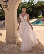 Wij zijn verliefd op deze jurk uit de Bohèmecollectie van Rosa Clará. De elegante slipdress wordt enkel gesierd door speelse spaghettibandjes. De bloemen lijken haast kleine pompoms en bewegen vrolijk mee met elke stap die je zet.