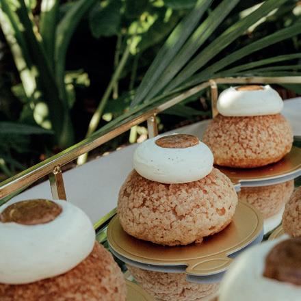 De afgebeelde choux zijn gevuld met luchtige mangocrème en afgewerkt met een zachte vanilleganache. Een krokante praliné van kokos en amandelen maakt deze creatie helemaal af. Om van te watertanden!