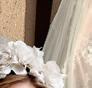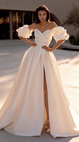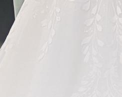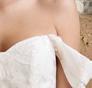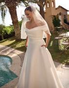 Deze romantische trouwjurk van organza met een o shoulder, gedrapeerd lijfje en geaccentueerde taille maakt jou tot absolute eyecatcher. De schat tige strikdetails, die als elegante hoge armbanden geplaatst zijn, maken de fijne, lichte look van Diane Legrand compleet.