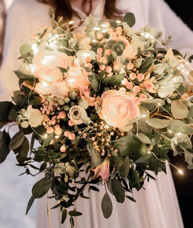 Dit bruidsboeket is perfect voor een avondbruiloft. Tussen het weelderige groen en de zachte perziken crèmekleurige bloemen is een lichtsnoer verwerkt dat het boeket een bijzondere glans geeft. Het resultaat? Prachtige foto’s met een unieke, sfeervolle uitstraling.