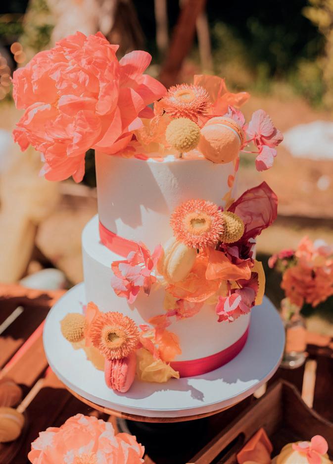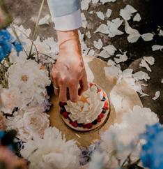 In het midden van de taart, die eruitziet als een waterlelie, zit een bloem van witte chocolade. In plaats van de traditionele taart aansnijden, plukken bruid en bruidegom elk een chocolade bloemblaadje uit het midden van de taart en voeren ze elkaar daarmee. Wat een prachtig idee!