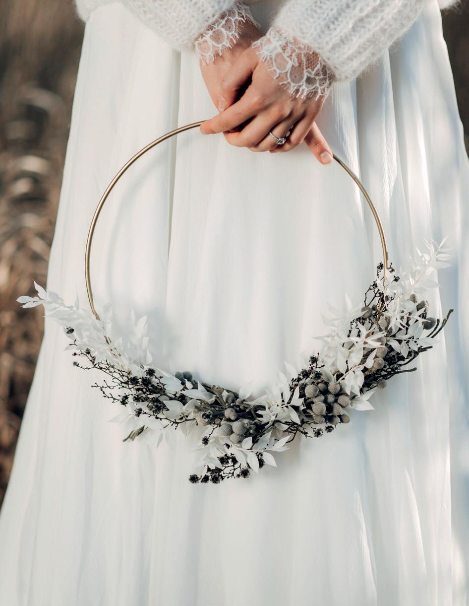 Wij zijn helemaal verliefd op dit coole bruidsboeket: de flower loop. De metalen ring kan in verschillende formaten worden vormgegeven, met verse of gedroogde bloemen. Als bruid kun je ‘m dragen of bijvoorbeeld gebruiken om twee stoelen – die van de bruid en bruidegom – te decoreren tijdens de ceremonie of aan de feesttafel.
