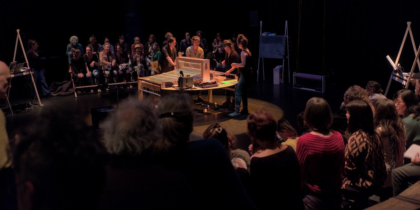 Lieu : dans le lieu du tissage ou dans un lieu dédié au spectacle vivant. Privilégier un espace avec une bonne acoustique (beaucoup de sons diffusés)