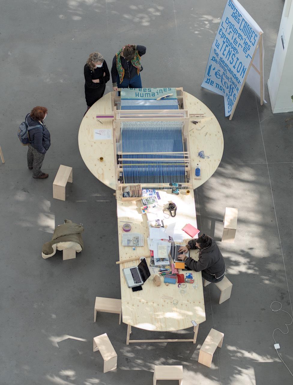 La table qui prolonge le métier à tisser permet de mener des ateliers (écriture ou autres), des microconférences ou de simplement partager un café.