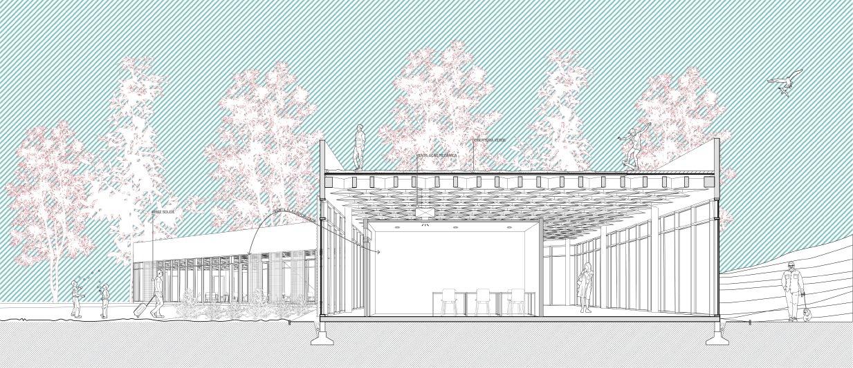 O desafio de projeto criado pela ela. lidou com um cenário possível no qual a “banda” entre o muro e o rio em Porto Alegre RS estaria em constante transformação - considerando camadas de água de diferentes alcances e profundidades.